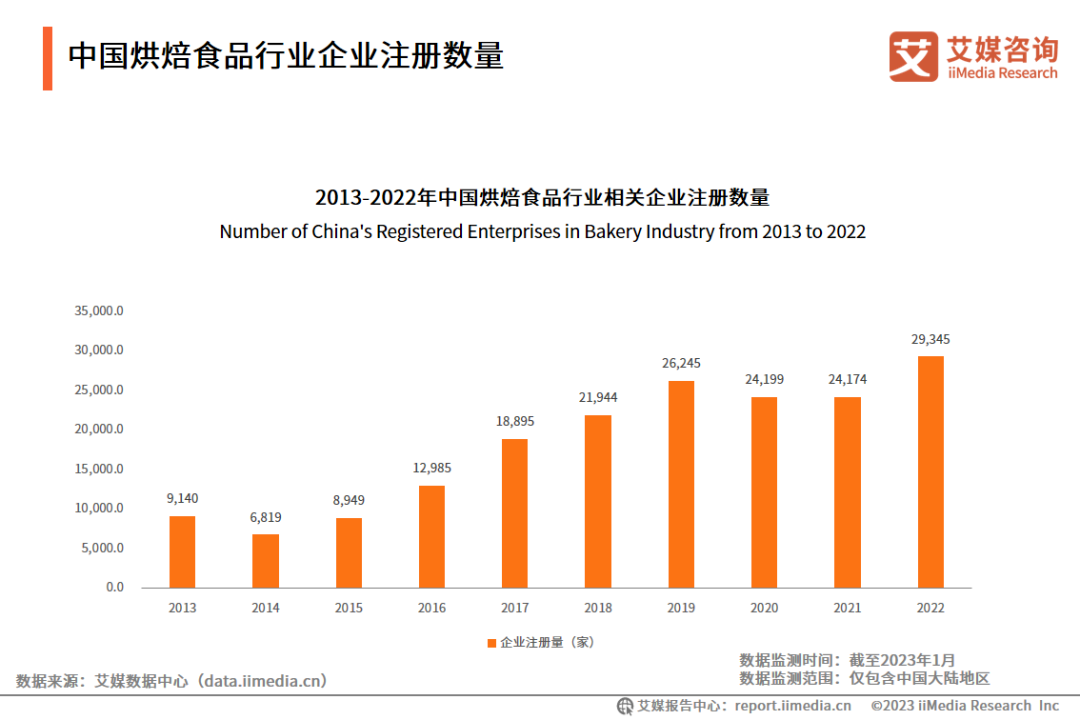 中國烘焙食品行業企業注冊數量,數據來源:艾媒數據中心