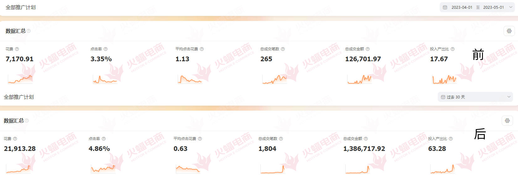 在方法上,用“標準計劃”提升搜索權重,用“智能計劃”完成轉化。在策略上,針對競品及時做出反擊。例如,競品用贈品形式提高轉化,變相降價,火蝠電商運營人員光隙(花名)則在贈品外還加上套裝,進而提高客單價。在多維運營之下,帶動店鋪整體銷量提升。經過為期30天的整體計劃,投產比從17逐漸提升到63,翻了3倍不止。